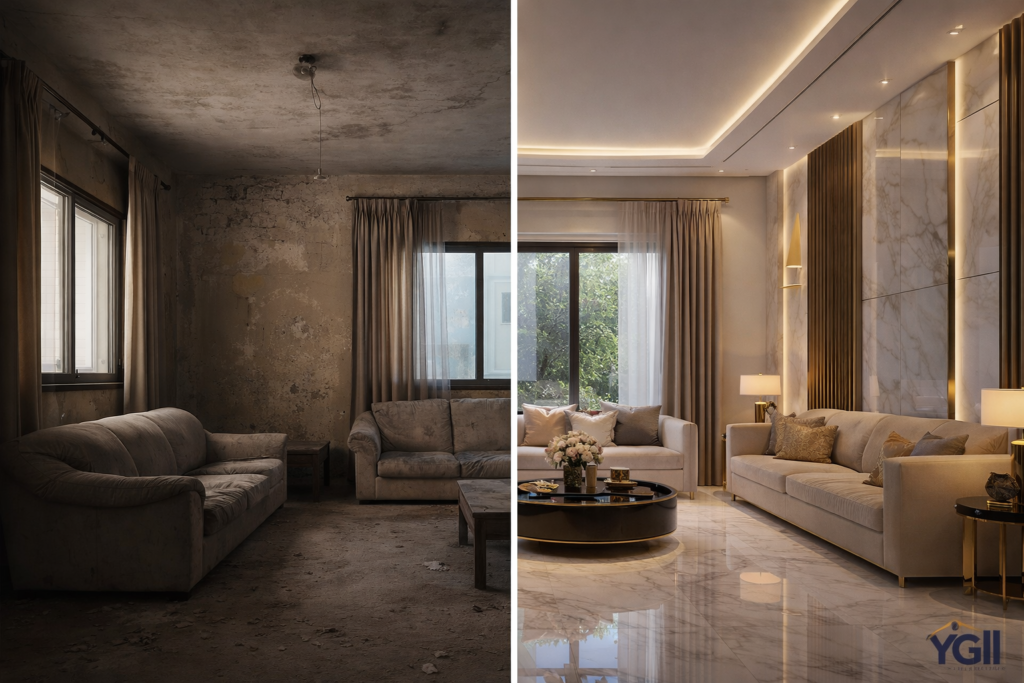 يشمل تجديد الأرضيات، إعادة طلاء الجدران، تحديث الأسقف الجبسية، وتحسين أنظمة الإضاءة.